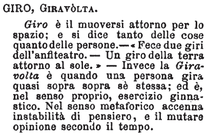 | Giro, Giravolta - Giro è il muoversi attorno per lo spazio; e si dice tanto delle cose quanto delle persone.-«Fece due giri dell'anfiteatro.-Un giro della terra attorno al sole.»-Invece la Giravolta è quando una persona gira quasi sopra sopra sè stessa; ed è, nel senso proprio, esercizio ginnastico. Nel senso metaforico accenna instabilità di pensiero, e il mutare opinione secondo tempo. [immagine] |