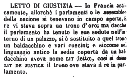 | Letto di giustizia - In Francia anticamente, allorchè i parlamenti e le assemblee della nazione si tenevano in campo aperto, il re vi stava sopra un trono d'oro; ma dacchè il parlamento ha tenuto le sue sedute nell'interno di un palazzo, si è sostituito a quel trono un baldacchino e vari cuscini; e siccome nel linguaggio antico la sedia coperta da un baldacchino aveva nome lit (letto), così si disse lit de justice il trono ove stava il re in parlamento. [immagine] |