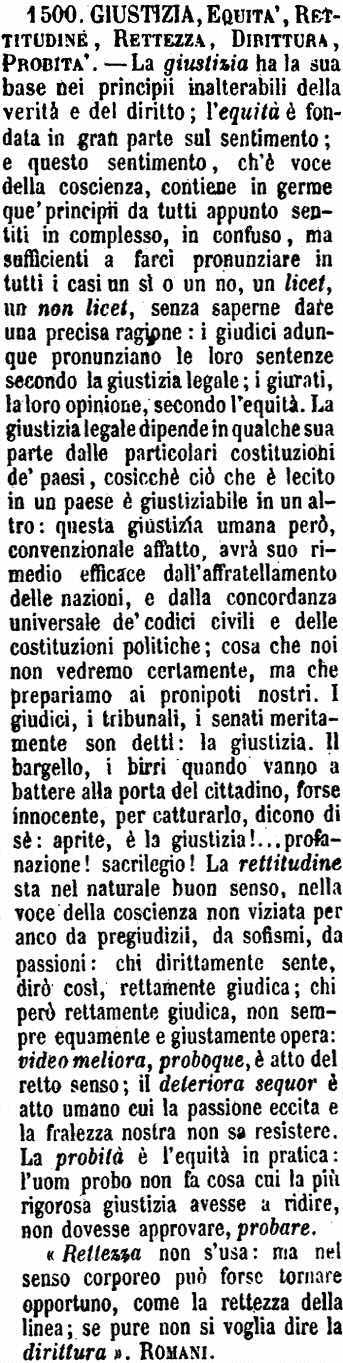 Giustizia, Equità, Rettitudine, Rettezza, Dirittura, Probità - La giustizia ha la sua base nei principii inalterabili della verità e del diritto; l'equità è fondata in gran parte sul sentimento; e questo sentimento, ch'è voce della coscienza, contiene in germe que' principii da tutti appunto sentiti in complesso, in confuso, ma sufficienti a farci pronunziare in tutti i casi un sì o un no, un licet, un non licet, senza saperne dare una precisa ragione: i giudici adunque pronunziano le loro sentenze secondo la giustizia legale; i giurati, la loro opinione, secondo l'equità. La giustizia legale dipende in qualche sua parte dalle particolari costituzioni de' paesi, cosicchè ciò che è lecito in un paese è giustiziabile in un altro: questa giustizia umana però, convenzionale affatto, avrà suo rimedio efficace dall'affratellamento delle nazioni, e dalla concordanza universale de' codici civili e delle costituzioni politiche; cosa che noi non vedremo certamente, ma che prepariamo ai pronipoti nostri. I giudici, i tribunali, i senati meritamente son detti: la giustizia. Il bargello, i birri quando vanno a battere alla porta del cittadino, forse innocente, per catturarlo, dicono di sè: aprite, è la giustizia!... profanazione! sacrilegio! La rettitudine sta nel naturale buon senso, nella voce della coscienza non viziata per anco da pregiudizii, da sofismi, da passioni: chi dirittamente sente, dirò così, rettamente giudica; chi però rettamente giudica, non sempre equamente e giustamente opera: video meliora, proboque, è atto del retto senso; il deteriora sequor è atto umano cui la passione eccita e la fralezza nostra non sa resistere. La probità è l'equità in pratica: l'uom probo non fa cosa cui la più rigorosa giustizia avesse a ridire, non dovesse approvare, probare.