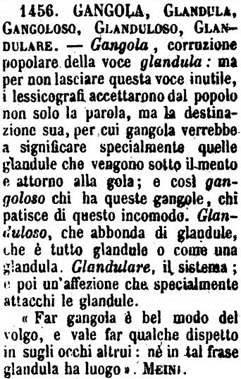 Gangola, Glandula, Gangoloso, Glanduloso, Glandulare - Gangola, corruzione popolare della voce glandula: ma per non lasciare questa voce inutile, i lessicografi accettarono dal popolo non solo la parola, ma la destinazione sua, per cui gangola verrebbe a significare specialmente quelle glandule che vengono sotto il mento e attorno alla gola; e così gangoloso chi ha queste gangole, chi patisce di questo incomodo. Glanduloso, che abbonda di glandule, che è tutto glandule o come una glandula. Glandulare, il sistema; e poi un'affezione che specialmente attacchi le glandule.