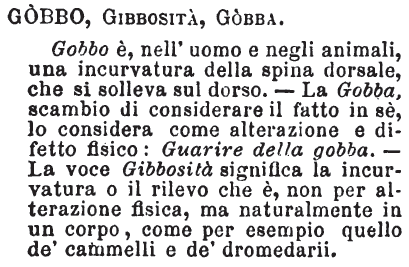 | Gobbo, Gibbosità, Gobba - Gobbo è, nell'uomo e negli animali, una incurvatura della spina dorsale, che si solleva sul dorso. - La Gobba, scambio di considerare il fatto in sè, lo considera come alterazione e difetto fisico: Guarire della gobba. - La voce Gibbosità significa la incurvatura o il rilievo che è, non per alterazione fisica, ma naturalmente in un corpo, come per esempio quello de' cammelli e de' dromedarii. [immagine] |