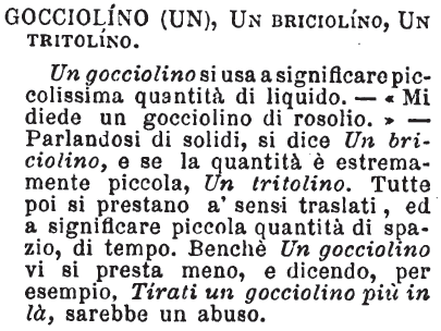 | Gocciolino (un), Un briciolino, Un tritolino - Un gocciolino si usa a significare piccolissima quantità di liquido. - «Mi diede un gocciolino di rosolio.» - Parlandosi di solidi, si dice Un briciolino, e se la quantità è estremamente piccola, Un tritolino. Tutte poi si prestano a ' sensi traslati, ed a significare piccola quantità di spazio, di tempo. Benchè Un gocciolino vi si presta meno, e dicendo, per esempio, Tirati un gocciolino più in là, sarebbe un abuso. [immagine] |