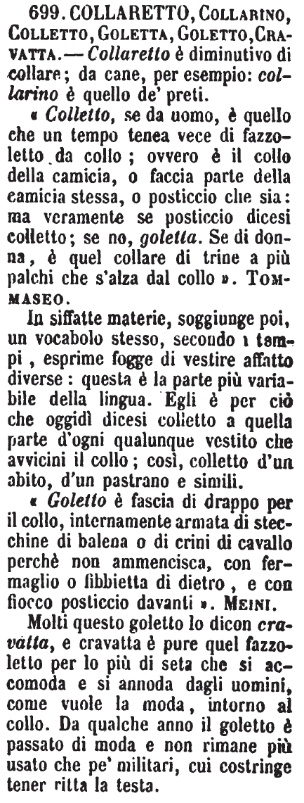 In siffatte materie, soggiunge poi, un vocabolo stesso, secondo i tempi, esprime fogge di vestire affatto diverse: questa è la parte più variabile della lingua. Egli è per ciò che oggidì dicesi colletto a quella parte d'ogni qualunque vestito che avvicini il collo; così, colletto d'un abito, d'un pastrano e simili.