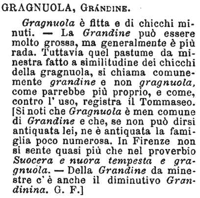| Gragnuola, Grandine - Gragnuola è fitta e di chicchi minuti. - La Grandine può essere molto grossa, ma generalmente è più rada. Tuttavia quel pastume da minestra fatto a similitudine dei chicchi della gragnuola, si chiama comunemente grandine e non gragnuola, come parrebbe più proprio, e come, contro l'uso, registra il Tommaseo. [Si noti che Gragnuola è men comune di Grandine e che, se non può dirsi antiquata lei, ne è antiquata la famiglia poco numerosa. In Firenze non si sente quasi più che nel proverbio Suocera e nuora tempesta e gragnuola. - Della Grandine da minestre c'è anche il diminutivo Grandinina. G. F.] [immagine] |
