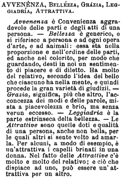 «La Bellezza non è altro che una ordinata concordia e quasi un'armonia occultamente risultante dalla composizione, unione e connessione di più membri diversi, e diversamente da sè e in sè, e secondo la loro propria qualità e bisogno, ben proporzionati e in certo modo belli, i quali, prima che alla conformazione d'un corpo si uniscano, sono tra loro differenti e discrepanti (1). «La Leggiadria (stando sempre all'uomo, anzi più particolarmente alla donna), vien definita dallo stesso Firenzuola in questi termini: «La Leggiadria non è altro che una osservanza di una tacita legge data e promulgata dalla natura nel muovere, portare, adoperare così tutta la persona insieme, come le membra particolari, con grazia, con modestia, con gentilezza, con misura, con garbo; in guisa che nessun movimento, nessun'azione sia senza regola, senza misura o senza disegno.» «Quindi è che la Leggiadria dà l'attrattiva alla Bellezza, la quale per sè non ne ha abbastanza (2) «La grazia, prosegue il Firenzuola, non è altro che uno splendore, il quale si eccita per occulta via da una certa particolar unione di alcuni membri, che noi non sappiamo dire: ei son questi, e' son quelli insieme con ogni consumata bellezza, ovvero perfezione, accozzati e ristretti, e accomodati insieme: il quale splendore si getta agli occhi nostri con tanta lor diligenza, con tanto soddisfacimento del cuore e contento della mente, che subito è lor forza volgere il nostro desio a quei dolci raggi tacitamente .... E chiamasi grazia, perciocchè ella fa grata e cara la persona, in cui risplende questo raggio, questa occulta proporzione si diffonde.» «Vaghezza è da Vago, e questo nome, secondo il Firenzuola, significa tre cose: la prima, Movimento da luogo a luogo, come ben mostra il Petrarca: Riduci i pensier vaghi a miglior loco. «La seconda, Desiderio; come è appresso il medesimo: Io son sì vago di mirar costei. «La terza, Bello. Il Petrarca pure: Gli atti vaghi e gli angelici costumi. Dal primo significato, cioè Movimento, ne è tratto Vagabondo; e da Vagabondo, che è quel medesimo che Vago, ne è tratto il secondo, cioè desideroso; perciocchè una cosa che è in moto e va vagando or quinci or quindi, par che accenda di sè maggior desiderio in altrui, che una che stia ferma e la quale noi possiam vedere a posta nostra. E con ciò sia che paja necessario, che tutte quelle cose noi desideriamo, noi le amiamo; e non si potendo amar cosa, che non sia, o non ci paja, bella, però ha ottenuto l'uso del comune parlare, che Vago significa Bello, e Vaghezza, Bellezza; ma in questo modo particolare nondimeno, che Vaghezza significhi quella Bellezza, che ha in sè tutte quelle parti per le quali chiunque la mira, forza gli è che ne divenga vago, cioè desideroso, e divenutone desideroso, per cercarla e per fruirla, stia sempre in moto col cuore, in viaggio co' pensieri e colla mente, divien vagabondo. «E' dunque Vaghezza una beltà attrattiva, inducente di sè desiderio di contemplarla e di fruirla. «Tanto importa la dignità nell'uomo, quanto la Venustà nelle donne. Perciocchè la dignità nell'uomo non è altro che un aspetto pieno di riverenza e di ammirazione; la Venustà adunque nella donna sarà uno aspetto nobile, casto, virtuoso, riverendo, ammirando e in ogni suo movimento pieno d'una modesta grandezza. «Di fatto, per quanto vaga, leggiadra e bella possa essere una donna scostumata, essa non può più aver vanto di venustà, che sta propriamente nella femminil dignità, che è la modestia, e procede da quella Venere celeste che gli antichi dissero madre di tutte le virtù. «Alcuni di questi nomi si adoperano pure nelle cose delle belle arti, ed hanno in questo caso diversa, ma non opposta definizione: e Bellezza chiamasi comunemente dagli artisti la giusta e squisita proporzione delle parti e dei colori. «La Grazia, dicono i pittori e gli scultori, sta nella movenza, ed è quella piacevolezza di movimento, la quale accresce la bellezza, ed alle volte è più gradita. Si considera nel soave moto di tutto il viso, ed anche negli occhi e nella bocca, nel favellare e nel ridere, nel moto delle mani e d'altre membra, e finalmente nella persona tutta, che soavemente atteggi senza stiracchiamento o affettazione. «Leggiadria è un certo portamento della persona rappresentata in pittura così leggiero ed agile, ch'e' pare che ella si muova, e quasi non abbia peso, ma leggerissimamente si sostenti: è proprio della gioventù. «Bellezza è generico, e si dice di ogni cosa che abbia concordia e buona proporzione di parti. «Leggiadrìa, grazia, e vaghezza possono stare senza la bellezza, ma non la venustà, che è sua compagna. «La leggiadrìa risplende particolarmente nel movimento, la grazia negli atti, la venustà nel contegno. «La vaghezza è piuttosto fuori della persona, è qualità estrinseca, la quale è piuttosto nel desiderio eccitato in altri. «Lasciando de' loro inimitabili pregi, troverai la leggiadria e la vaghezza nell'Ariosto; nel Tasso la grazia e la venustà; la bellezza in tutti e due. «Vaghezza di colori usa il Vasari, e Vago chiamano i pittori un quadro, il merito principale del quale sia nel colorito che alletta i più. «La Leggiadria e la Grazia, parlando d'atti e di movimenti, pare che differiscano particolarmente in questo, che la Leggiadria è più vivace, la Grazia più riposata. La Grazia sfugge ogni sforzo, ogni affettazione; la Leggiadria rende talvolta amabili l'uno e l'altro.» (1) «Comecchè malagevolmente esprimere appunto si possa, che cosa bellezza sia, nondimeno .... voglio che sappi, che dove ha convenevole misura fra le parti verso di sè, e fra le parti e 'l tutto, quivi è la bellezza; e quella cosa veramente bella si può chiamare, in cui la detta misura si trova .... vuole essere la bellezza uno quanto si può il più.» (Casa, Galateo, cap. 26). - «La bellezza non è altro che una grazia, che di proporzione e di convenienza nasce e d'armonia nelle cose; la quale, q