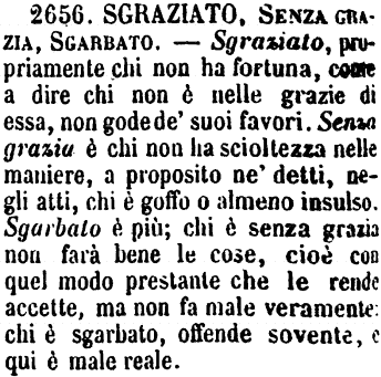 | Sgraziato, Senza grazia, Sgarbato - Sgraziato, propriamente chi non ha fortuna, come a dire chi non è nelle grazie di essa, non gode de' suoi favori. Senza grazia è chi non ha scioltezza nelle maniere, a proposito ne' detti, negli atti, chi è goffo o almeno insulso. Sgarbato è più; chi è senza grazia non farà bene le cose, cioè con quel modo prestante che le rende accette, ma non fa male veramente: chi è sgarbato, offende sovente, e qui è male reale. [immagine] |