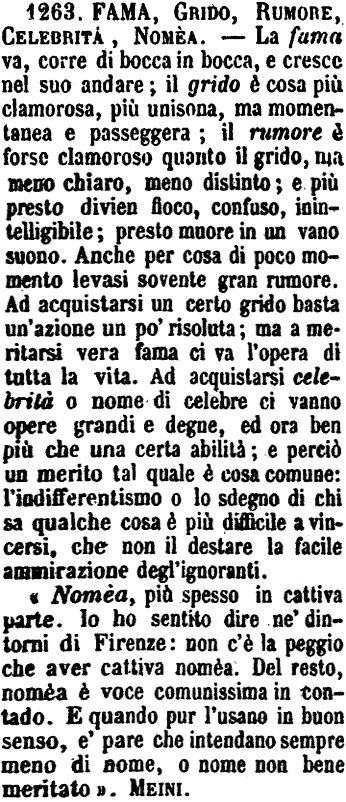 Fama, Grido, Rumore, Celebrità, Nomèa - La fama va, corre di bocca in bocca, e cresce nel suo andare; il grido è cosa più clamorosa, più unisona, ma momentanea e passeggera; il rumore è forse clamoroso quanto il grido, ma meno chiaro, meno distinto; e più presto divien fioco, confuso, inintelligibile; presto muore in un vano suono. Anche per cosa di poco momento levasi sovente gran rumore. Ad acquistarsi un certo grido basta un'azione un po' risoluta; ma a meritarsi vera fama ci va l'opera di tutta la vita. Ad acquistarsi celebrità o nome celebre ci vanno opere grandi e degne, ed ora ben più che una certa abilità; e perciò un merito tal quale è cosa comune: l'indifferentismo o lo sdegno di chi sa qualche cosa è più difficile a vincersi, che non il destare la facile ammirazione degl'ignoranti.