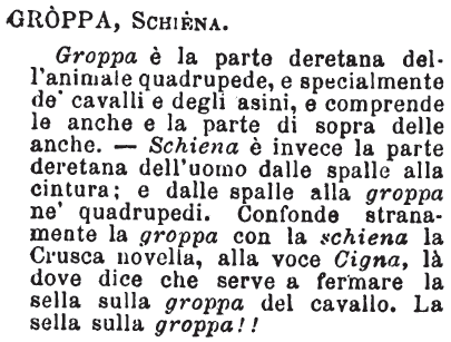 Groppa, Schiena - Groppa è la parte deretana dell'animale quadrupede, e specialmente de' cavalli e degli asini, e comprende le anche e la parte di sopra delle anche. - Schiena è invece la parte deretana dell'uomo dalle spalle alla cintura; e dalle spalle alla groppa ne' quadrupedi. Confonde stranamente la groppa con la schiena la Crusca novella, alla voce Cigna, là dove dice che serve a fermare la sella sulla groppa del cavallo. La sella sulla groppa!! [immagine]