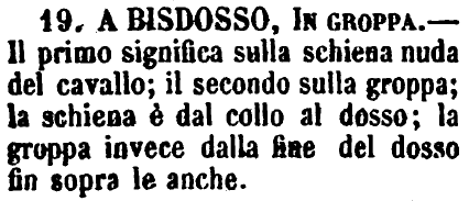 A bisdosso, In groppa - Il primo significa sulla schiena nuda del cavallo; il secondo sulla groppa; la schiena è dal collo al dosso; la groppa invece dalla fine del dosso fin sopra le anche. [immagine]