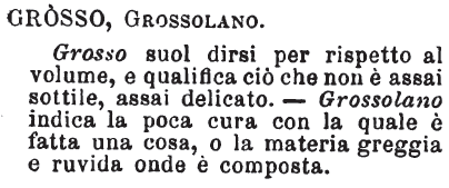 Grosso, Grossolano - Grosso suol dirsi per rispetto al volume, e qualifica ciò che non è assai sottile, assai delicato. - Grossolano indica la poca cura con la quale è fatta una cosa, o la materia greggia e ruvida onde è composta. [immagine]