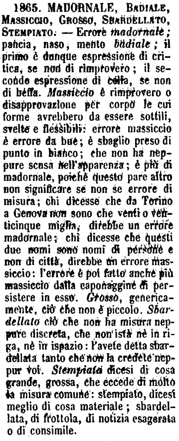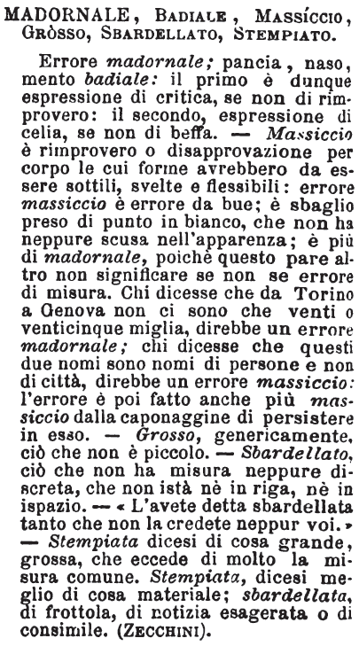 Madornale, Badiale, Massiccio, Grosso, Sbardellato, Stempiato - Errore madornale; pancia, naso, mento badiale: il primo è dunque espressione di critica, se non di rimprovero: il secondo, espressione di celia, se non di beffa. - Massiccio è rimprovero o disapprovazione per corpo le cui forme avrebbero da essere sottili, svelte e flessibili: errore massiccio è errore da bue; è sbaglio preso di punto in bianco, che non ha neppure scusa nell'apparenza; è più di madornale, poichè questo pare altro non significare se non se errore di misura. Chi dicesse che da Torino a Genova non ci sono che venti o venticinque miglia, direbbe un errore madornale; chi dicesse che questi due nomi sono nomi di persone e non di città, direbbe un errore massiccio; l'errore è poi fatto anche più massiccio dalla caponaggine di persistere in esso. - Grosso, genericamente, ciò che non è piccolo. - Sbardellato, ciò che non ha misura neppure discreta, che non istà nè in riga, nè in ispazio. - « L'avete detta sbardellata tanto che non la credete neppur voi. » - Stempiata dicesi di cosa grande, grossa, che eccede di molto la misura comune. Stempiata, dicesi meglio di cosa materiale; sbardellata, di frottola, di notizia esagerata o di consimile. (Zecchini). [immagine]