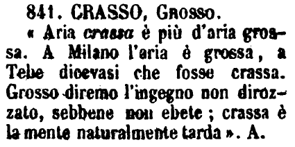 Crasso, Grosso - «Aria crassa è più d'aria grossa. A Milano l'aria è grossa, a Tebe dicevasi che fosse crassa. Grosso diremo l'ingegno non dirozzato, sebbene non ebete; crassa è la mente naturalmente tarda». A. [immagine]