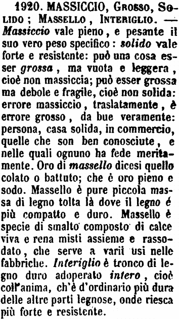 Massiccio, Grosso, Solido, Massello, Interiglio - Massiccio vale pieno, e pesante il suo vero peso specifico: solido vale forte e resistente: può una cosa esser grossa, ma vuota e leggera, cioè non massiccia; può esser grossa ma debole e fragile, cioè non solida: errore massiccio, traslatamente, è errore grosso, da bue veramente: persona, casa solida, in commercio, quelle che son ben conosciute, e nelle quali ognuno ha fede meritamente. Oro di massello dicesi quello colato o battuto; che è oro pieno e sodo. Massello è pure piccola massa di legno tolta là dove il legno è più compatto e duro. Massello è specie di smalto composto di calce viva e rena misti assieme e rassodato, che serve a varii usi nelle fabbriche. Interiglio è tronco di legno duro adoperato intero, cioè coll'anima, ch'è d'ordinario più dura delle altre parti legnose, onde riesca più forte e resistente. [immagine]