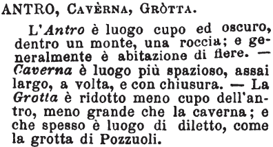 | Grotta, Spelonca, Tana, Antro - La Grotta è il luogo vuoto, dentro a un monte, che può essere ricetto di animali e anche d'uomini. Può altresì essere artificiale, e servire di umano recesso. - Spelonca è più orrida, più grande, buja, profonda. - Tana è stretta e orrida; ed è ricetto di fiere, come lupi, volpi e simili. - Antro è grotta anche più nobile; ma è voce della poesia e dello stile nobile. [immagine] |