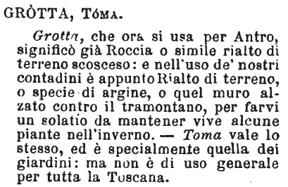 | Grotta, Toma - Grotta, che ora si usa per Antro, significò già Roccia o simile rialto di terreno scosceso: e nell'uso de' nostri contadini è appunto Rialto di terreno, o specie di argine, o quel muro alzato contro il tramontano, per farvi un solatio da mantener vive alcune piante nell'inverno. - Toma vale lo stesso, ed è specialmente quella dei giardini: ma non è di uso generale per tutta la Toscana. [immagine] |