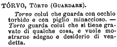 Torvo, Torto (guardare) - Torvo colui che guarda con occhio torbido e con piglio minaccioso. - Torto guarda colui che si tiene gravato di quache cosa, e vuole mostrarne sdegno e desiderio di vendetta. [immagine]