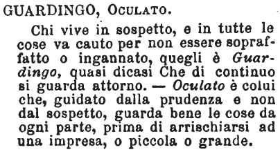 Guardingo, Oculato - Chi vive in sospetto, e in tutte le cose va cauto per non essere sopraffatto o ingannato, quegli è Guardingo, quasi dicasi Che di continuo si guarda attorno. - Oculato è colui che, guidato dalla prudenza e non dal sospetto, guarda bene le cose da ogni parte, prima di arrischiarsi ad una impresa, o piccola o grande. [immagine]