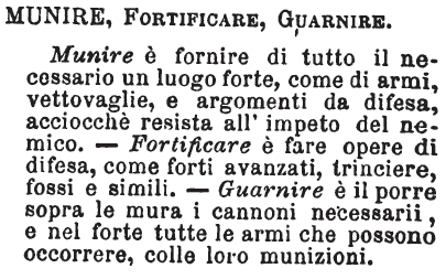 Munire, Fortificare, Guarnire - Munire è fornire di tutto il necessario un luogo forte, come di armi, vettovaglie, e argomenti da difesa, acciocchè resista all'impeto del nemico. - Fortificare è fare opere di difesa, come forti avanzati, trinciere, fossi e simili. - Guarnire è il porre sopra le mura i cannoni necessarii, e nel forte tutte le armi che possono occorrere, colle loro munizioni. [immagine]