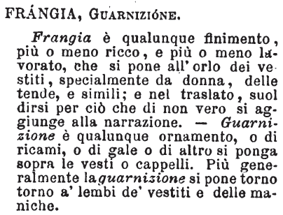 Frangia, Guarnizione - Frangia è qualunque finimento, più o meno ricco, e più o meno lavorato, che si pone all'orlo dei vestiti, specialmente da donna, delle tende, e simili; e nel traslato, suol dirsi per ciò che di non vero si aggiunge alla narrazione. - Guarnizione è qualunque ornamento, o di ricami, o di gale o di altro si ponga sopra le vesti o cappelli. Più generalmente la guarnizione si pone torno torno a' lembi de' vestiti e delle maniche. [immagine]