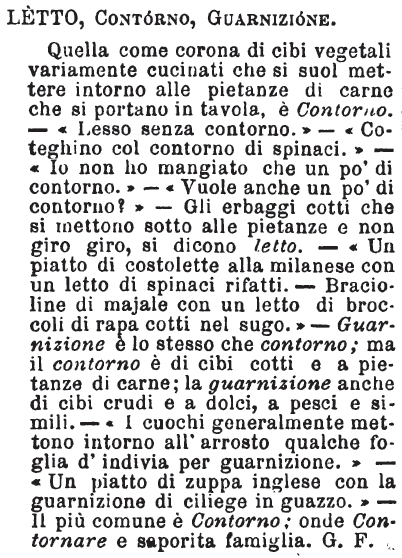 Letto, Contorno, Guarnizione - Quella come corona di cibi vegetali variamente cucinati che si suol mettere intorno alle pietanze di carne che si portano in tavola, è Contorno. - «Lesso senza contorno.» - «Coteghino col contorno di spinaci.» - «Io non ho mangiato che un po' di contorno.» - «Vuole anche un po' di contorno?» - Gli erbaggi cotti che si mettono sotto alle pietanze e non giro giro, si dicono letto. - «Un piatto di costolette alla milanese con un letto di spinaci rifatti. - Bracioline di majale con un letto di broccoli di rapa cotti nel sugo.» - Guarnizione è lo stesso che contorno; ma il contorno è di cibi cotti e a pietanze di carne; la guarnizione anche di cibi crudi e a dolci, a pesci e simili. - «I cuochi generalmente mettono intorno all'arrosto qualche foglia d'indivia per guarnizione.» - «Un piatto di zuppa inglese con la guarnizione di ciliege in guazzo.» - Il più comune è Contorno; onde Contornare e saporita famiglia. G. F. [immagine]
