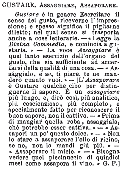 | Assaporare, Assaggiare, Degustare, Gustare - Per assaggiare si mangia o si beve un tantino di ciò che vuolsi assaggiare per vedere se piace; si assaggia o saggia anche l'oro sulla pietra di paragone; si assaggiano i beni o i mali della vita: per degustare basta prenderne un tantino sulla lingua. Si assapora ciò che si trova di proprio gusto; vale quasi mangiare cibo prediletto con una certa compiacenza. Gustare è proprio sentire il gusto assaggiando: talora si assaggia e non si gusta: ha poi senso affine ad assaporare, ma esprime minor compiacenza: un bicchiere di buon vino, un buon boccone possono essere gustati da tutti; ma l'assaporarli con molle compiacenza è proprio d'un epicureo. Gustare ha anche senso immateriale, si gusta la musica, la poesia; si gusta una nobile compiacenza nel fare una buona azione. [immagine] |