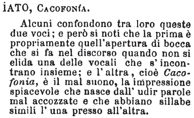 Iato, Cacofonia - Alcuni confondono tra loro queste due voci; e però si noti che la prima è propriamente quell'apertura di bocca che si fa nel discorso quando non si elida una delle vocali che s'incontrano insieme; e l'altra, cioè Cacofonia, è il mal suono, la impressione spiacevole che nasce dall'udir parole mal accozzate e che abbiano sillabe simili l'una presso all'altra. [immagine]