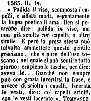 Il, In - «Pallida il viso, scomposta i capelli, e siffatti modi, segnatamente la lingua poetica li ama. Ben si potrebbe dire: pallida in viso, ma non già sciolta ne' capelli, o altro simile. E però la prosa stessa può talvolta ammettere questo gentile grecismo, che è pure dell'uso toscano; nel quale si può sentire tutto giorno: era pieno le tasche, per dire: aveva le... Giacchè non sempre può con grazia invertirsi la frase, e invece di sciolta i capelli, lacerata le vesti, dire: co' capelli sciolti, con le vesti lacerate». Tommaseo. [immagine]