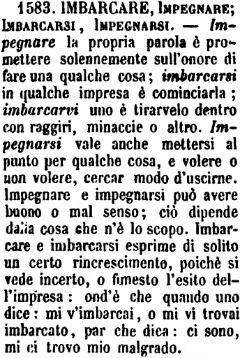 | Imbarcare, Impegnare; Imbarcarsi, Impegnarsi - Impegnare la propria parola è promettere solennemente sull'onore di fare una qualche cosa; imbarcarsi in qualche impresa è cominciarla; imbarcarvi uno è tirarvelo dentro con raggiri, minaccie o altro. Impegnarsi vale anche mettersi al punto per qualche cosa, e volere o non volere, cercar modo d'uscirne. Impegnare e impegnarsi può avere buono o mal senso; ciò dipende dalla cosa che n'è lo scopo. Imbarcare e imbarcarsi esprime di solito un certo rincrescimento, poichè si vede incerto, o funesto l'esito dell'impresa: ond'è che quando uno dice: mi v'imbarcai, o mi vi trovai imbarcato, par che dica: ci sono, mi ci trovo mio malgrado. [immagine] |