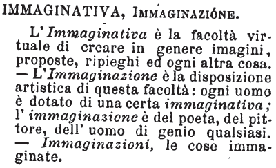 | Immaginativa, Immaginazione - L'Immaginativa è la facoltà virtuale di creare in genere imagini, proposte, ripieghi ed ogni altra cosa. - L'Immaginazione è la disposizione artistica di questa facoltà: ogni uomo è dotato di una certa immaginativa; l'immaginazione è del poeta, del pittore, dell'uomo di genio qualsiasi. - Immaginazioni, le cose immaginate. [immagine] |
