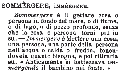 Sommergere, Immergere - Sommergere è il gettare cosa o persona in fondo del mare, o di fiume, o di lago, o di pozzo profondo, senza che la cosa o persona torni più in su. - Immergere è Mettere una cosa, una persona, una parte della persona nell'acqua o calda o fredda, tenendovela quanto bisogna, e poi ritirarla su. «Anticamente si battezzava immergendo il bambino nel fonte.» [immagine]