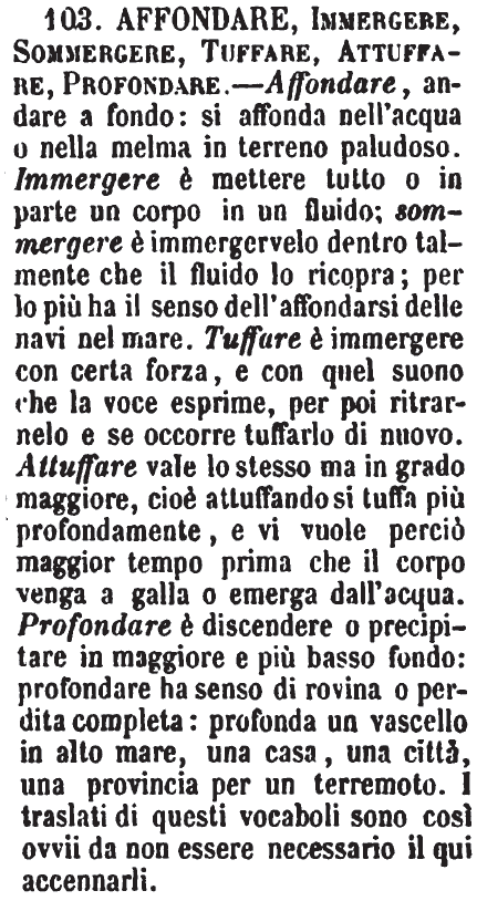 Affondare, Immergere, Sommergere, Tuffare, Attuffare, Profondare - Affondare, andare a fondo: si affonda nell'acqua o nella melma in terreno paludoso. Immergere è mettere tutto o in parte un corpo in un fluido; sommergere è immergervelo dentro talmente che il fluido lo ricopra; per lo più ha il senso dell'affondarsi delle navi nel mare. Tuffare è immergere con certa forza, e con quel suono che la voce esprime, per poi ritrarnelo e se occorre tuffarlo di nuovo. Attuffare vale lo stesso ma in grado maggiore, cioè attuffando si tuffa più profondamente, e vi vuole perciò maggior tempo prima che il corpo venga a galla o emerga dall'acqua. Profondare è discendere o precipitare in maggiore e più basso fondo: profondare ha senso di rovina o perdita completa: profonda un vascello in alto mare, una casa, una città, una provincia per un terremoto. I traslati di questi vocaboli sono così ovvii da non essere necessario il qui accennarli. [immagine]