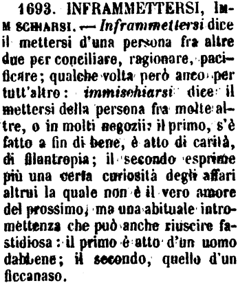 Inframmettersi, Immischiarsi - Inframmettersi dice il mettersi d'una persona fra altre due per conciliare, ragionare, pacificare; qualche volta però anco per tutt'altro: immischiarsi dice il mettersi della persona fra molte altre, o in molti negozii: il primo, s'è fatto a fin di bene, è atto di carità, di filantropia; il secondo esprime più una certa curiosità degli affari altrui la quale non è il vero amore del prossimo, ma una abituale intromettenza che può anche riuscire fastidiosa: il primo è atto d'un uomo dabbene; il secondo, quello d'un ficcanaso. [immagine]