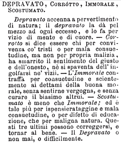 Depravato, Corrotto, Immorale, Scostumato - Depravato accenna a pervertimento di natura; il depravato la dà pel mezzo ad ogni eccesso, e lo fa per vizio di mente e di cuore. - Corrotto si dice essere chi per convivenza co' tristi o per mala consuetudine, ma non per propria malizia, ha smarrito il sentimento del giusto e dell'onesto, nè si spaventa dell'ingolfarsi ne' vizii. - L'Immorale contraffà per consuetudine e scientemente ai dettami della buona morale, senza sentirne vergogna, e senza curare il biasimo altrui. - Scostumato è meno che Immorale; ed è tale più per ispensierataggine e mala consuetudine, o per difetto di educazione, che per maligna natura. Questi tre ultimi possono correggersi, e tornar al bene. - Il Depravato o non mai, o difficilmente. [immagine]