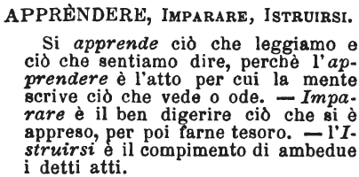 | Apprendere, Imparare, Istruirsi - Si apprende ciò che leggiamo e ciò che sentiamo dire, perchè l'apprendere è l'atto per cui la mente scrive ciò che vede o ode. - Imparare è il ben digerire ciò che si è appreso, per poi farne tesoro. - l'Istruirsi è il compimento di ambedue i detti atti. [immagine] |