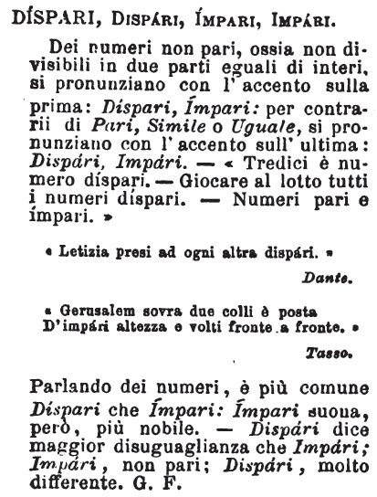 Dispari, Impari - Dei numeri non pari, ossia non divisibili in due parti eguali di interi, si pronunziano con l'accento sulla prima: Díspari, Ímpari: per contrarii di Pari, Simile o Uguale, si pronunziano con l'accento sull'ultima: Dispári, Impári. - «Tredici è numero díspari - Giocare al lotto tutti i numeri díspari. - Numeri pari e ímpari.»