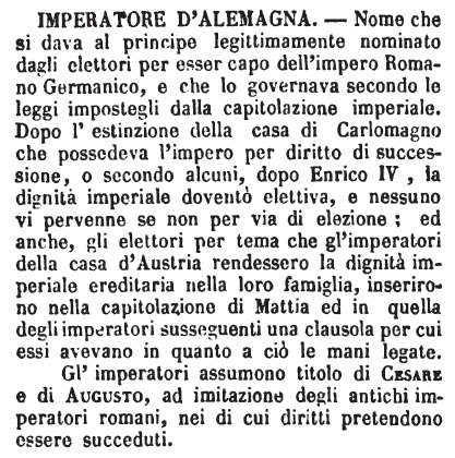 | Imperatore d’Alemagna - Nome che si dava al principe legittimamente nominato dagli elettori per esser capo dell'impero Romano Germanico, e che lo governava secondo le leggi impostegli dalla capitolazione imperiale. Dopo l'estinzione della casa di Carlomagno che posseva l'impero per diritto di successione, o secondo alcuni, dopo Enrico IV, la dignità imperiale doventò elettiva, e nessuno vi pervenne se non per via di elezione; ed anche, gli elettori per tema che gl'imperatori della casa d'Austria rendessero la dignità imperiale ereditaria nella loro famiglia, inserirono nella capitolazione di Mattia ed in quella degli imperatori susseguenti una clausola per cui essi avevano in quanto a ciò le mani legate.