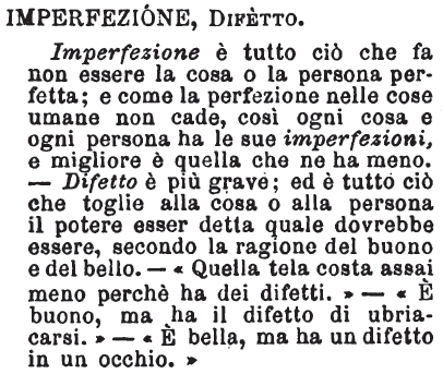 | Imperfezione, Difetto - Imperfezione è tutto ciò che fa non essere la cosa o la persona perfetta; e come la perfezione nelle cose umane non cade, così ogni cosa e ogni persona ha le sue imperfezioni, e migliore è quella che ne ha meno. - Difetto è più grave; ed è tutto ciò che toglie alla cosa o alla persona il potere esser detta quale dovrebbe essere, secondo la ragione del buono e del bello. - «Quella tela costa assai meno perchè ha dei difetti.» - «E' buono, ma ha il difetto di ubriacarsi.» - «E' bella, ma ha un difetto in un occhio.» [immagine] |