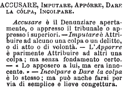 | Accusare, Imputare, Apporre, Dare la colpa, Incolpare - Accusare è il Denunziare apertamente, o appresso il tribunale o appresso i superiori. - Imputare è Attribuire ad alcuno una colpa o un delitto, o di atto o di volontà. - L'Apporre è parimente Attribuire ad altri una colpa; ma senza fondamento certo. - «Lo apposero a lui, ma era innocente.» - Incolpare e Dare la colpa è lo stesso; ma può anche farsi per via di semplice e lieve congettura. [immagine] |