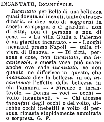 | Incantato, Incantevole - Incantato per Bello di una bellezza quasi dovuta ad incanti, tanto è straordinaria, si dice solo di soggiorni in aperta campagna o di giardini, non di città, non di persone e non di cose. - « La villa Giulia a Palermo è un giardino incantato. » - « Luoghi incantati presso Napoli - sulla riviera di Genova. » - Di città, persone e cose, non incantato, ma incantevole, e questa voce può usarsi anche ove cade incantato, se non quanto ne differisce in questo, che incantato dice la bellezza in sè, incantevole l'effetto della bellezza in chi l'ammira. - « Firenze è incantevole. - Donna - voci - occhi - volto incantevoli. » - Chi dicesse incantati degli occhi o del volto, direbbe occhi inebetiti e volto di persona rimasta stupidamente ammirata o sorpresa. G. F. [immagine] |