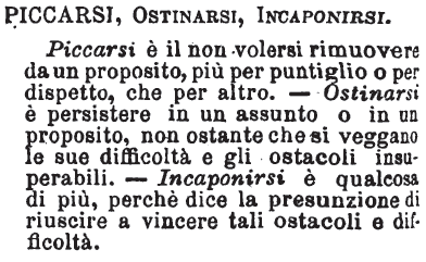 | Piccarsi, Ostinarsi, Incaponirsi - Piccarsi è il non volersi rimuovere da un proposito, più per puntiglio o per dispetto, che per altro. - Ostinarsi è persistere in un assunto o in un proposito, non ostante che si veggano le sue difficoltà e gli ostacoli insuperabili. - Incaponirsi è qualcosa di più, perché dice la presunzione di riuscire a vincere tali ostacoli e difficoltà. [immagine] |