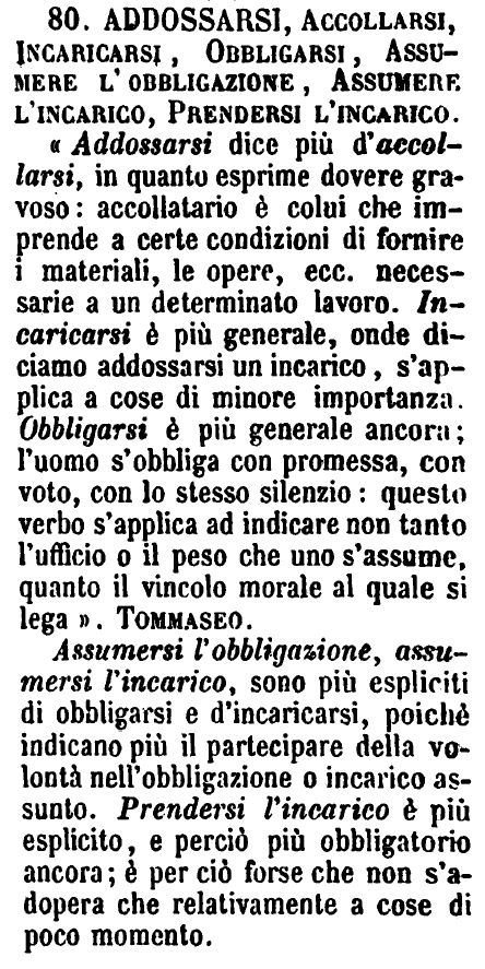 | Addossarsi, Accollarsi, Incaricarsi, Obbligarsi, Assumere l’obbligazione, Assumere l’incarico, Prendersi l’incarico - «Addossarsi dice più d'accollarsi, in quanto esprime dovere gravoso: accollatario è colui che imprende a certe condizioni di fornire i materiali, le opere, ecc. necessarie a un determinato lavoro. Incaricarsi è più generale, onde diciamo addossarsi un incarico, s'applica a cose di minore importanza. Obbligarsi è più generale ancora; l'uomo s'obbliga con promessa, con voto, con lo stesso silenzio: questo verbo s'applica ad indicare non tanto l'ufficio o il peso che uno s'assume, quanto il vincolo morale al quale si lega». Tommaseo.