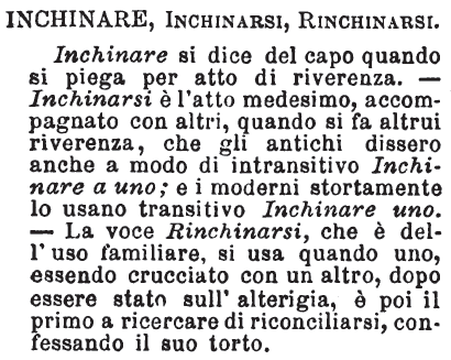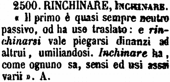 Rinchinare, Inchinare - « Il primo è quasi sempre neutro passivo, od ha uso traslato: e rinchinarsi vale piegarsi dinanzi ad altrui, umiliandosi. Inchinare ha, come ognuno sa, sensi ed usi assai varii ». A. [immagine]