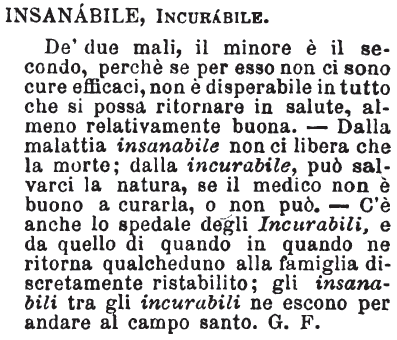 Vi sono degl'incurabili che da venti anni giacciono inchiodati in un letto o su d'una sedia: una malattia acuta in tre, cinque o sette giorni alla più lunga, può dichiararsi disperata. Le malattie dell'anima, abbenchè sembrino talvolta incurabili, non hanno mai da credersi disperate, la ragione rinsavisce talvolta; la Provvidenza talaltra sa mandare ineffabili consolazioni e rimedii. Incurabile vale che è inutile il curare; insanabile, che si vede o prevede non potersi guarire o sanare, che non può apprestarvisi il vero rimedio perchè o non esiste, o non è conosciuto, o perchè la lesione dell'organo o l'alterazione dell'organismo è tale da non potersi ripristinare nello stato suo normale: incurabile meglio dice l'ammalato, insanabile o la parte offesa o la malattia. Irrimediabile non è parola medica; riguarda tutt'altro ordine di cose, e più le civili e le morali: però irrimediabili sono talora gli errori de' medici nella diagnosi d'una malattia, per cui l'ammalato peggiora invece di guarire, e se ne va al Creatore. [immagine]