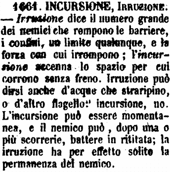 Incursione, Irruzione - Irruzione dice il numero grande dei nemici che rompono le barriere, i confini, un limite qualunque, e la forza con cui irrompono; l'incursione accenna lo spazio per cui corrono senza freno. Irruzione può dirsi anche d'acque che straripino, o d'altro flagello: incursione, no. L'incursione può essere momentanea, e il nemico può, dopo una o più scorrerie, battere in ritirata; la irruzione ha per effetto solito la permanenza del nemico. [immagine]