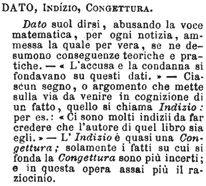 | Dato, Indizio, Congettura - Dato suol dirsi, abusando la voce matematica, per ogni notizia, ammessa la quale per vera, se ne desumono conseguenze teoriche e pratiche. - «L'accusa e la condanna si fondavano su questi dati.» - Ciascun segno, o argomento che mette sulla via da venire in cognizione di un fatto, quello si chiama Indizio: per es.: «Ci sono molti indizii per far credere che l'autore di quel libro sia egli.» - L'Indizio è quasi una Congettura; solamente i fatti su cui si fonda la Congettura sono più incerti; e in questa opera assai più il raziocinio. [immagine] |