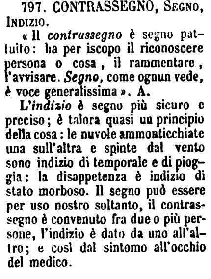| Contrassegno, Segno, Indizio - «Il contrassegno è segno pattuito: ha per iscopo il riconoscere persona o cosa, il rammentare, l'avvisare. Segno, come ognun vede, è voce generalissima». A.