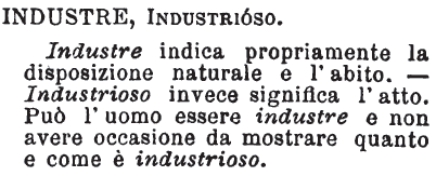 Industre, Industrioso - Industre indica propriamente la disposizione naturale e l'abito. - Industrioso invece significa l'atto. Può l'uomo essere industre e non avere occasione da mostrare quanto e come è industrioso. [immagine]