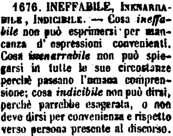 | Ineffabile, Inenarrabile, Indicibile - Cosa ineffabile non può esprimersi per mancanza d'espressioni convenienti. Cosa inenarrabile non può spiegarsi in tutte le sue circostanze perchè passano l'umana comprensione; cosa indicibile non può dirsi, perchè parrebbe esagerata, o non deve dirsi per convenienza e rispetto verso persona presente al discorso. [immagine] |