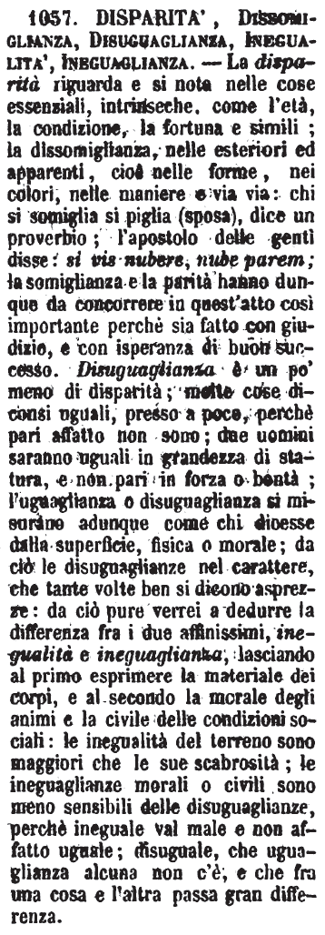 | Disparità, Dissomiglianza, Disuguaglianza, Inegualità, Ineguaglianza - La disparità riguarda e si nota nella cose essenziali, intrinseche, come l'età, la condizione, la fortuna e simili; la dissomiglianza, nelle esteriori ed apparenti, cioè nelle forme, nei colori, nelle maniere e via via: chi si somiglia si piglia (sposa), dice un proverbio; l'apostolo delle genti disse: si vis nubere, nube parem; la somiglianza e la parità hanno dunque da concorrere in quest'atto così importante perchè sia fatto con giudizio, e con isperanza di buon successo. Disuguaglianza è un po' meno di disparità; molte cose diconsi uguali, presso a poco, perchè pari affatto non sono; due uomini saranno uguali in grandezza di statura, e non pari in forza o bontà; l'uguaglianza o disuguaglianza si misurano adunque come chi dicesse dalla superficie, fisica o morale; da ciò le disuguaglianze nel carattere, che tante volte ben si dicono asprezze: da ciò pure verrei a dedurre la differenza fra i due affinissimi, inegualità e ineguaglianza, lasciando al primo esprimere la materiale dei corpi, e al secondo la morale degli animi e la civile delle condizioni sociali: le inegualità del terreno sono maggiori che le sue scabrosità; le ineguaglianze morali o civili sono meno sensibili delle disuguaglianze, perchè ineguale val male e non affatto uguale; disuguale, che uguaglianza alcuna non c'è, e che fra una cosa e l'altra passa gran differenza. [immagine] |