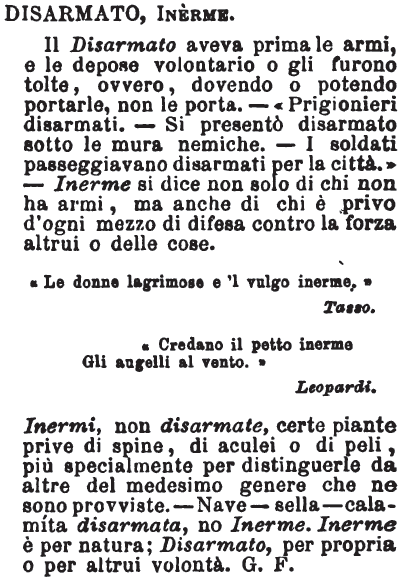 Disarmato, Inerme - Il Disarmato aveva prima le armi, e le depose volontario o gli furono tolte, ovvero, dovendo o potendo portarle, non le porta. - « Prigionieri disarmati. - Si presentò disarmato sotto le mura nemiche. - I soldati passeggiavano disarmati per la città. » - Inerme si dice non solo di chi non ha armi, ma anche di chi è privo d'ogni mezzo di difesa contro la forza altrui o delle cose.